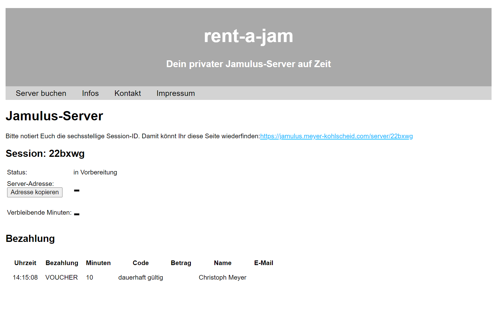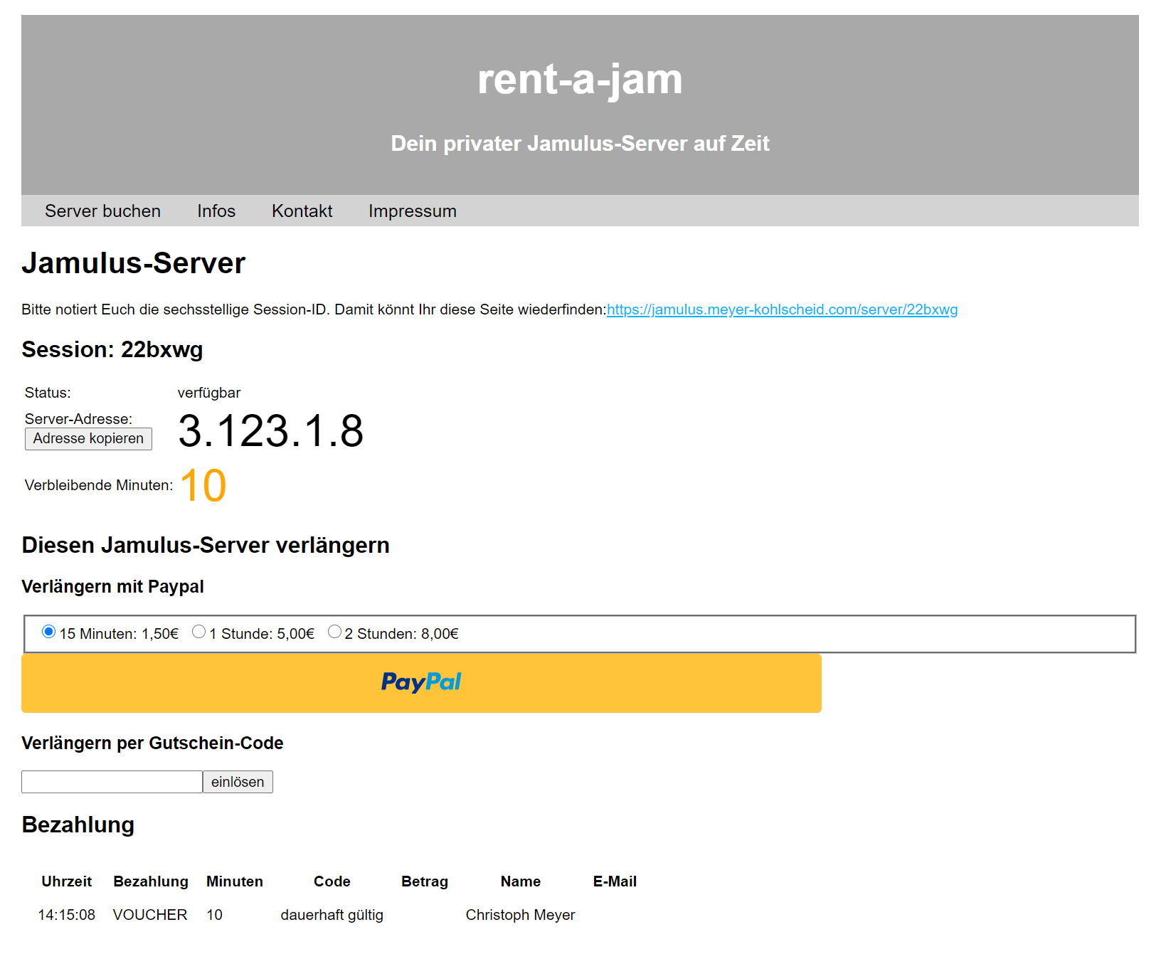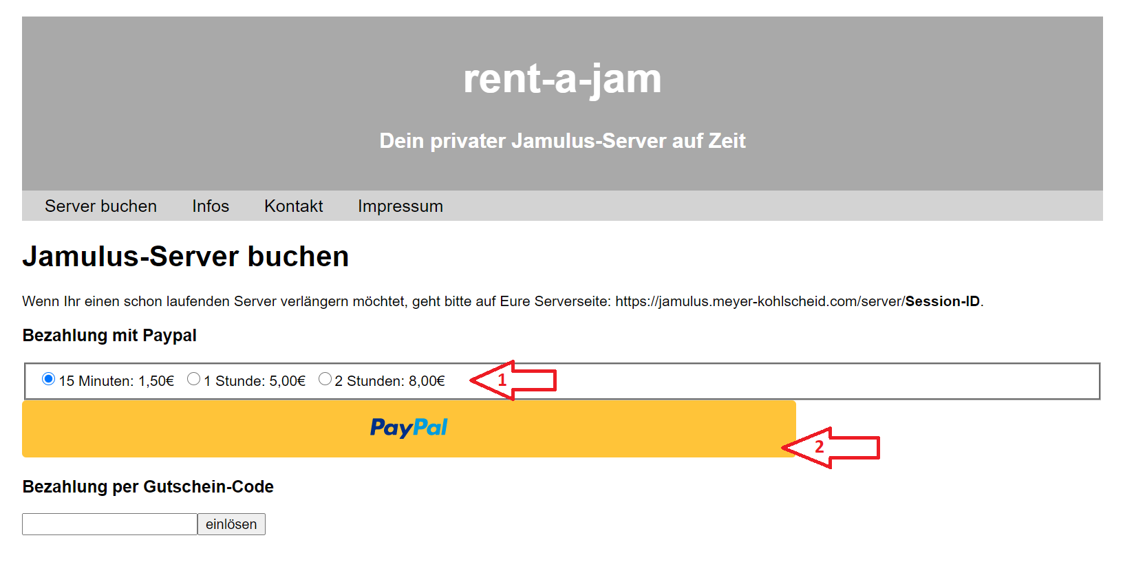 Die Buchung startet auf der Homepage von jamulus.meyer-kohlscheid.com. Dort entscheidet Ihr Euch für eine gewünschte Dauer (keine Sorge, Ihr könnt später verlängern) und klickt dann auf den Paypal-Button. Solltet Ihr einen Gutschein bekommen haben, könnt Ihr alterativ zur Paypal-Zahlung diesen Code unten eintragen.