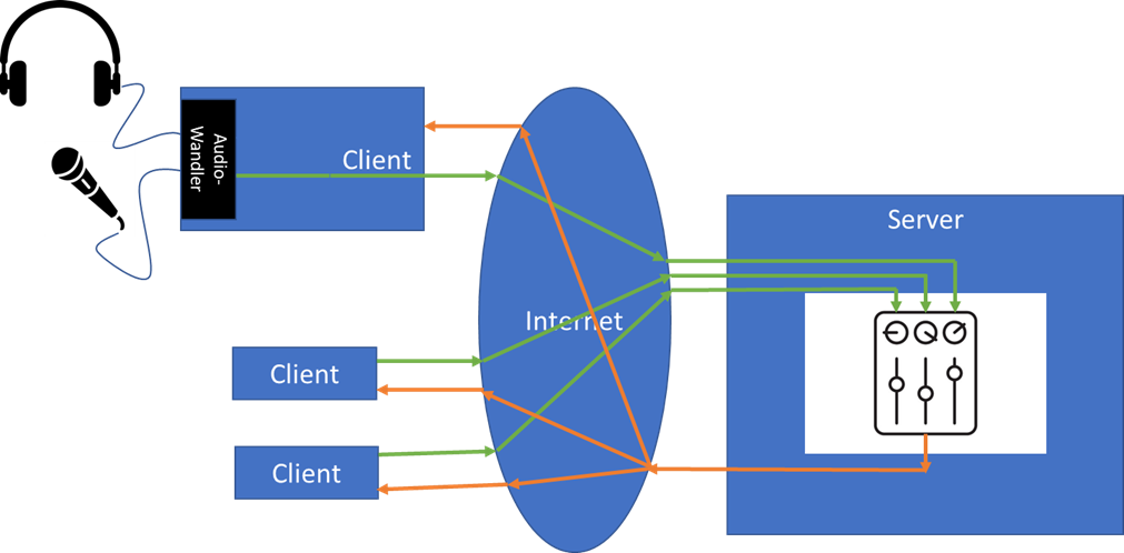 Wenn man alles gut einstellt, kann man mit Jamulus Latenzen von 30-40 ms erreichen, das ist in etwa die Zeit, die der Schall braucht, um etwa 10 m zurückzulegen. Das ist deutlich unter dem o.g. typischen Wert für zoom, und ermöglicht gemeinsames synchrones musizieren. Nur zum Vergleich: Am Telefon empfindet man eine Latenz von 190 ms schon beim Sprechen als störend. Bei zoom sind wir da etwas gnädiger…