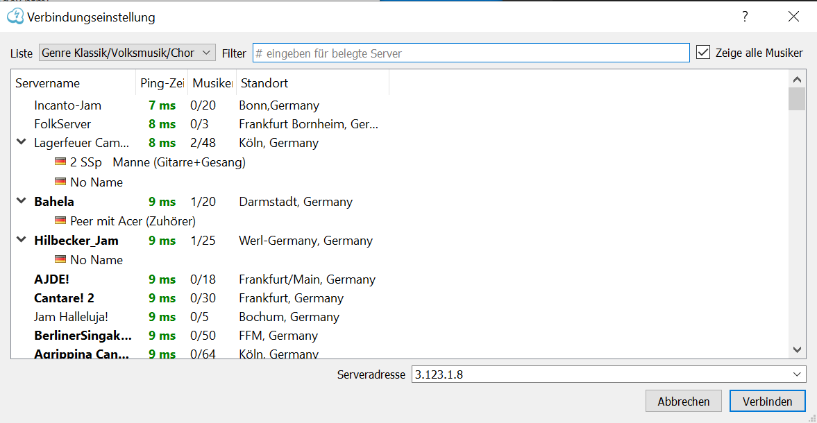 Auf der Server-Seite seht Ihr die Adresse, unter der der Server zu erreichen ist, auf dem Bild ist das die 3.123.1.8. Diese Adresse gebt Ihr an Eure Mitmusiker weiter. Dazu könnt Ihr auch den "Adresse kopieren"-Button benutzen, der die Adressen in den Zwischenspeicher kopiert. Alle Musiker können sich dann mit Eurem neuen Server verbinden, indem sie unten rechts im Jamulus-"Verbinden"-Fenster die Adresse eintragen: